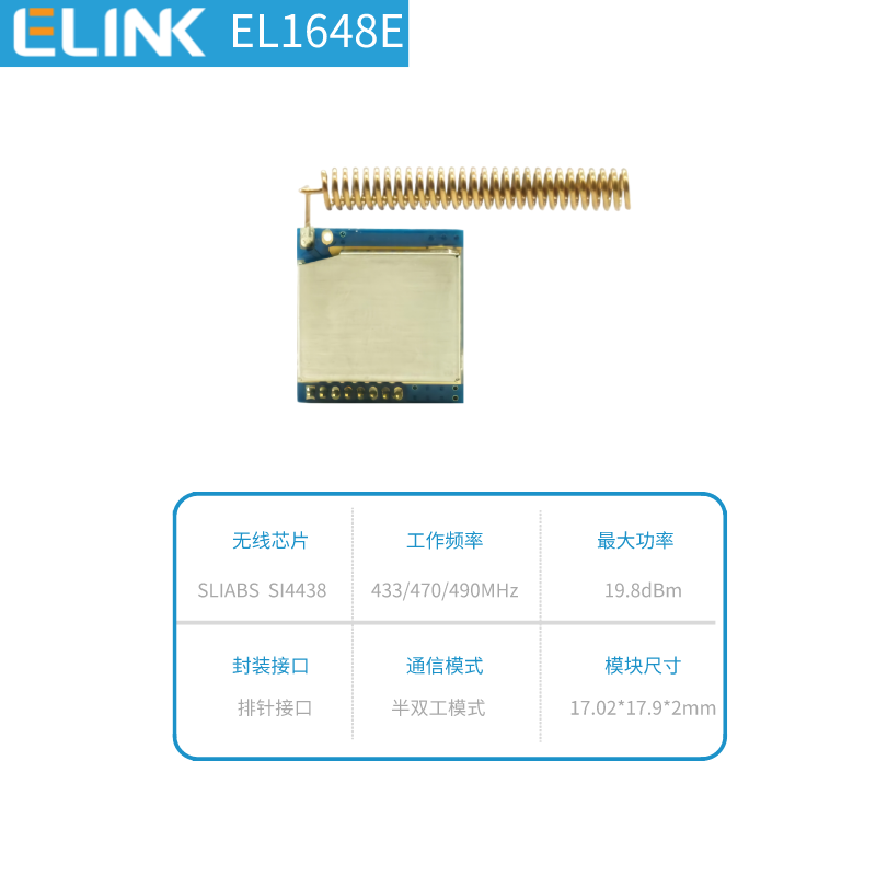 EL1648E是一款采用SI4438內(nèi)核設(shè)計(jì)的輸出功率為100mW的高性能無(wú)線收發(fā)通訊模組。工作頻段為425MHz~525MHz,默認(rèn)頻段490MHz。