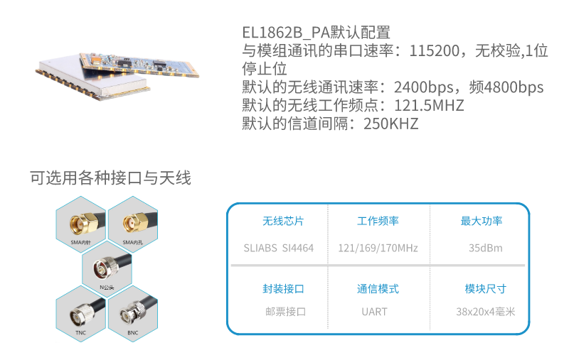 EL1862B_PA具有尺寸小,功率大,靈敏度高,傳輸距離遠(yuǎn),通訊數(shù)率高,在無(wú)線速率2.4kbps下通訊距離在空曠地實(shí)測(cè)距離15公里以上,內(nèi)部自動(dòng)完成通訊協(xié)議轉(zhuǎn)換和數(shù)據(jù)收發(fā)控制等特點(diǎn)。