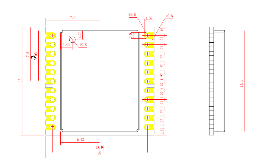 EL1669D是一款采用源自軍用戰(zhàn)術(shù)通信系統(tǒng)的LoRa調(diào)制技術(shù)設(shè)計(jì)的模塊,完美解決了小數(shù)據(jù)量在復(fù)雜環(huán)境中的超遠(yuǎn)距通信問題,默認(rèn)頻段為433MHz。 EL1669D是高性能低電流的收發(fā)模組,采用SX1278內(nèi)核設(shè)計(jì),包括完整的發(fā)送器和接收器。接收靈敏度為-148dBm,最大輸出功率+20dBm,支持(G)FSK,OOK調(diào)制方式,相較傳統(tǒng)調(diào)制技術(shù), EL1669D模塊在抑制同頻干擾的性能方面也具有明顯優(yōu)勢,解決了傳統(tǒng)設(shè)計(jì)方案無法同時(shí)兼顧距離、抗擾和功耗的弊端。另外,芯片集成了+20dBm的可調(diào)功率放大器,可獲得超過-148dBm的接收靈敏度,無線性能達(dá)到了行業(yè)領(lǐng)先水平,對(duì)于遠(yuǎn)距離傳輸且對(duì)可靠性要求極高的場合,該方案是不二之選。 模塊將SX1278的所有引了出來,用戶可根據(jù)不同的應(yīng)用靈活使用它們。為保證產(chǎn)品的穩(wěn)定可靠性能,在設(shè)計(jì)過程中,我們對(duì)射頻方面的性能做了全面、長期的測試;生產(chǎn)上,選用了高頻板材和頻射專用元器件來保證產(chǎn)品的使用壽命。