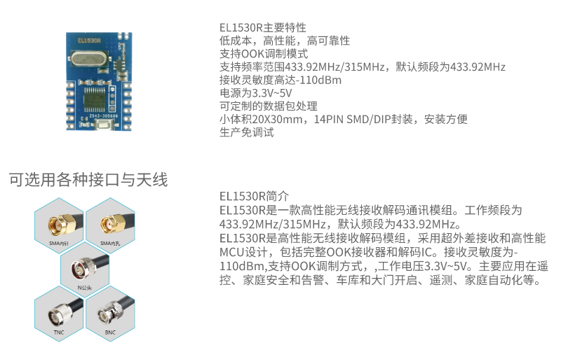 EL1530R是高性能無線接收解碼模組,采用超外差接收和高性能MCU設(shè)計(jì),包括完整OOK接收器和解碼IC。接收靈敏度為-110dBm,支持OOK調(diào)制方式,,工作電壓3.3V~5V。主要應(yīng)用在遙控、家庭安全和告警、車庫和大門開啟、遙測、家庭自動化等。