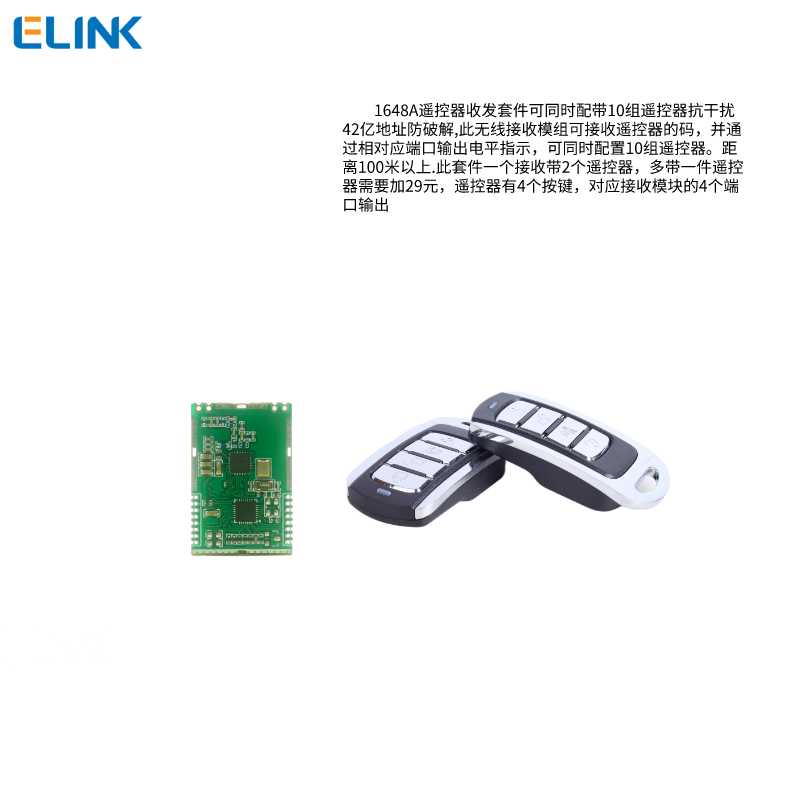 EL_1648A 系列是一款低成本,高性能的 FSK 無線透明數(shù)據(jù)收發(fā)模塊。此無線接收模組可接收遙控器的碼,并通過相對應(yīng)端口輸出電平指示,可同時(shí)配置10組遙控器。