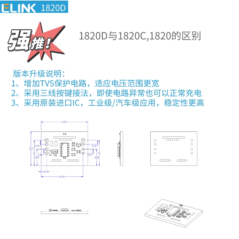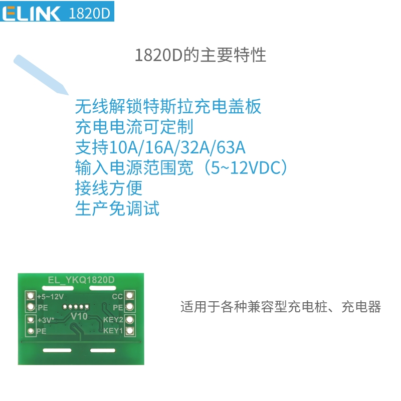 1.EL_YKQ1820D簡(jiǎn)介EL_YKQ1820D是一款用于新能源車充電槍的無(wú)線控制模塊,可解鎖特斯拉車型的充電蓋板。EL_YKQ1820D可用于解鎖特斯拉電動(dòng)車的充電蓋板,使用于各種充電設(shè)備,可選充電功率,無(wú)線遙控解鎖充電蓋板。 2.EL_YKQ1820D主要特性? 無(wú)線解鎖特斯拉充電蓋板? 充電電流可定制? 支持10A/16A/32A/63A? 輸入電源范圍寬(5~12VDC)?